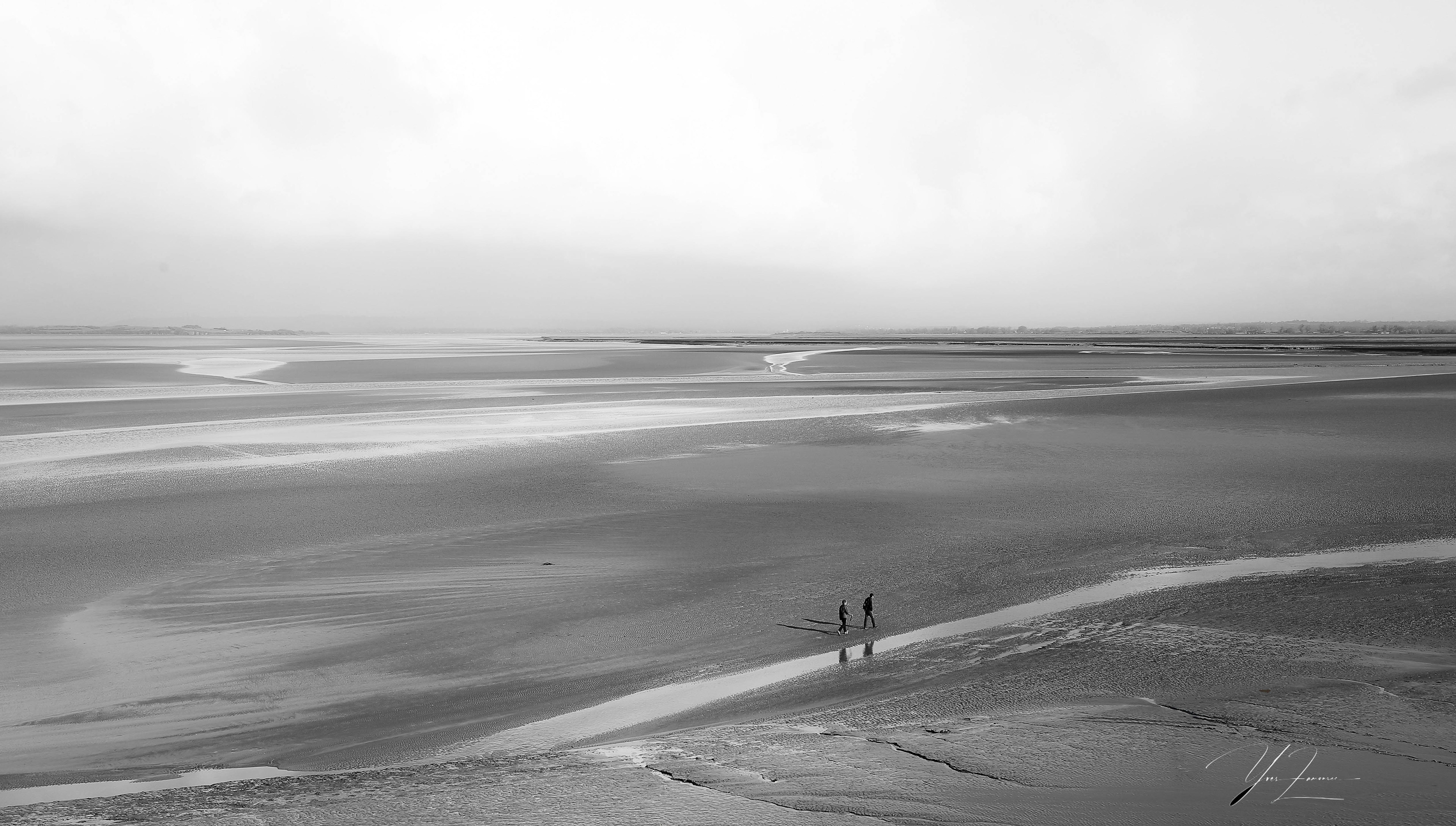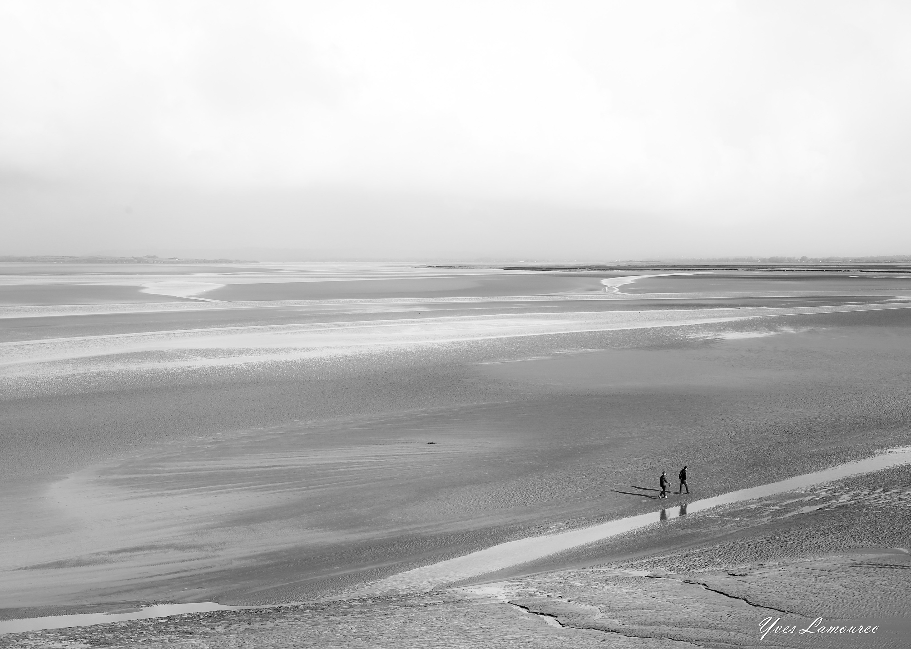 Cette œuvre évoque la quiétude d’une solitude choisie face à l’infini de la baie du Mont-Saint-Michel. La plage, traitée en fines strates de nuances délicatement superposées, se transforme en un espace presque abstrait où la lumière sculpte des formes d’apparence picturale.