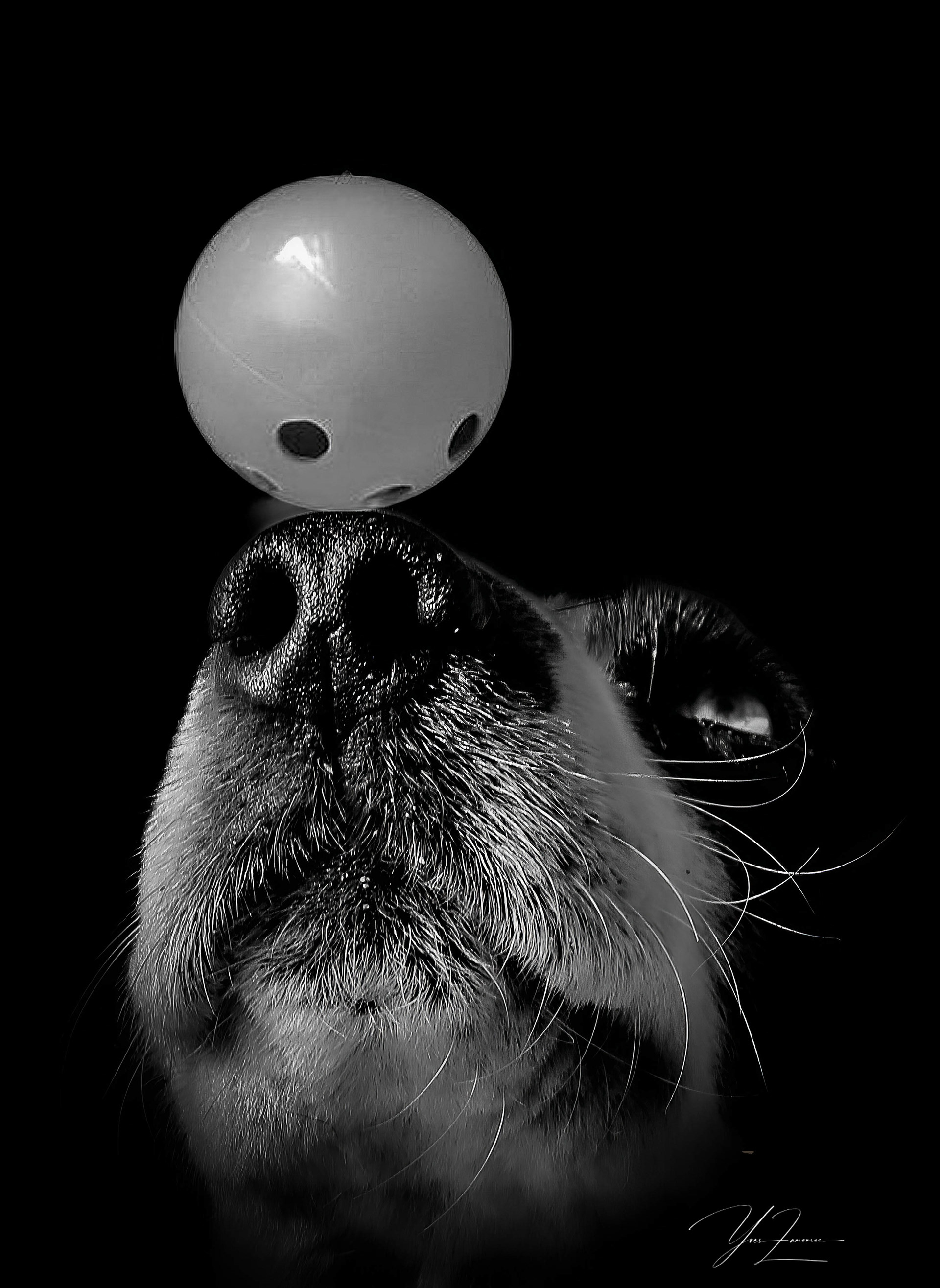 Photographie en noir et blanc d’un chien en posture d’équilibre, capturée dans un clair-obscur dramatique qui sculpte chaque détail de son museau.