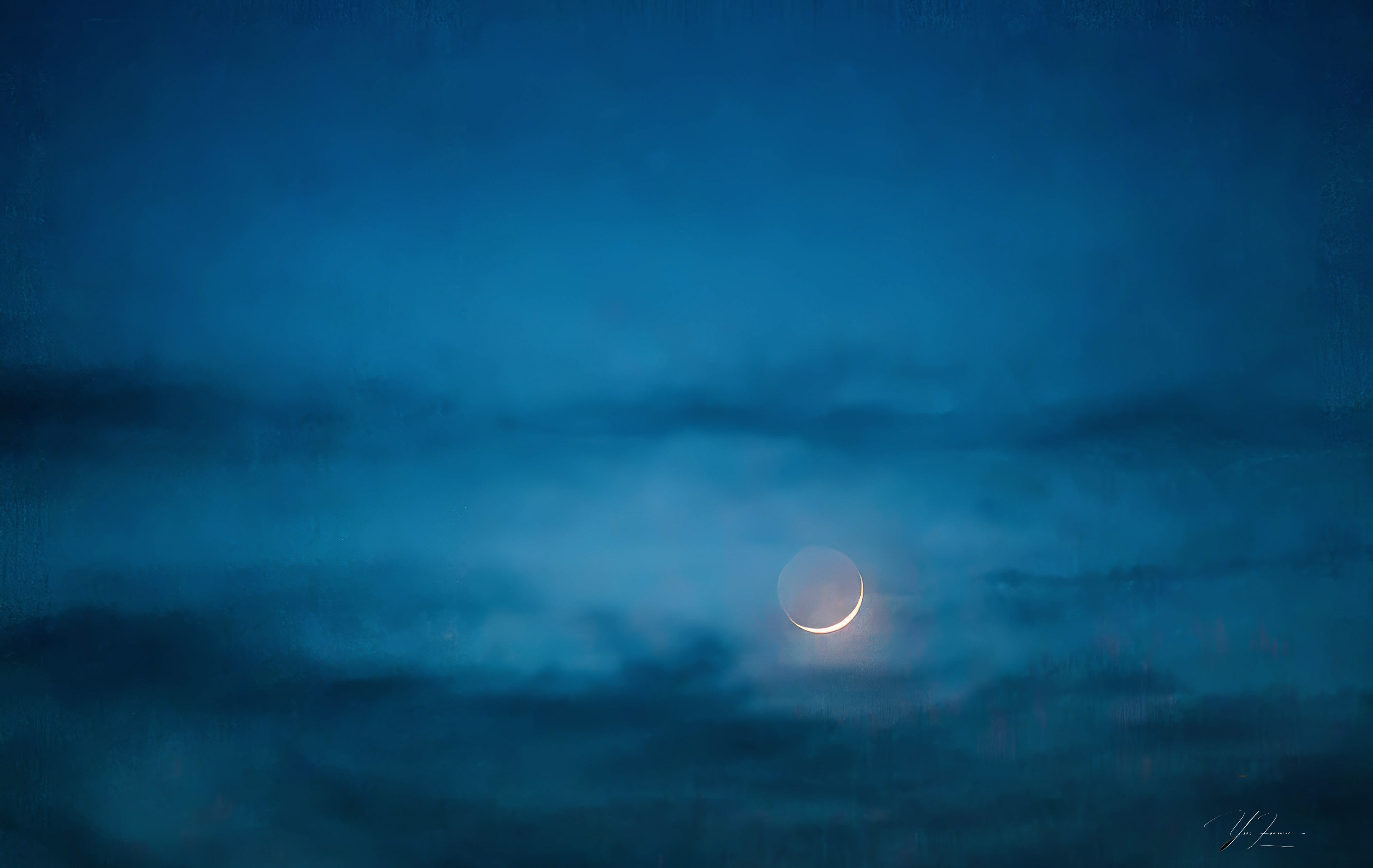 Cette œuvre révèle la délicatesse d’un croissant de lune émergeant silencieusement derrière un voile de nuages nocturnes. Le bleu profond du ciel, mêlé aux nuances douces de lumière lunaire, crée une atmosphère méditative où le temps semble suspendu.