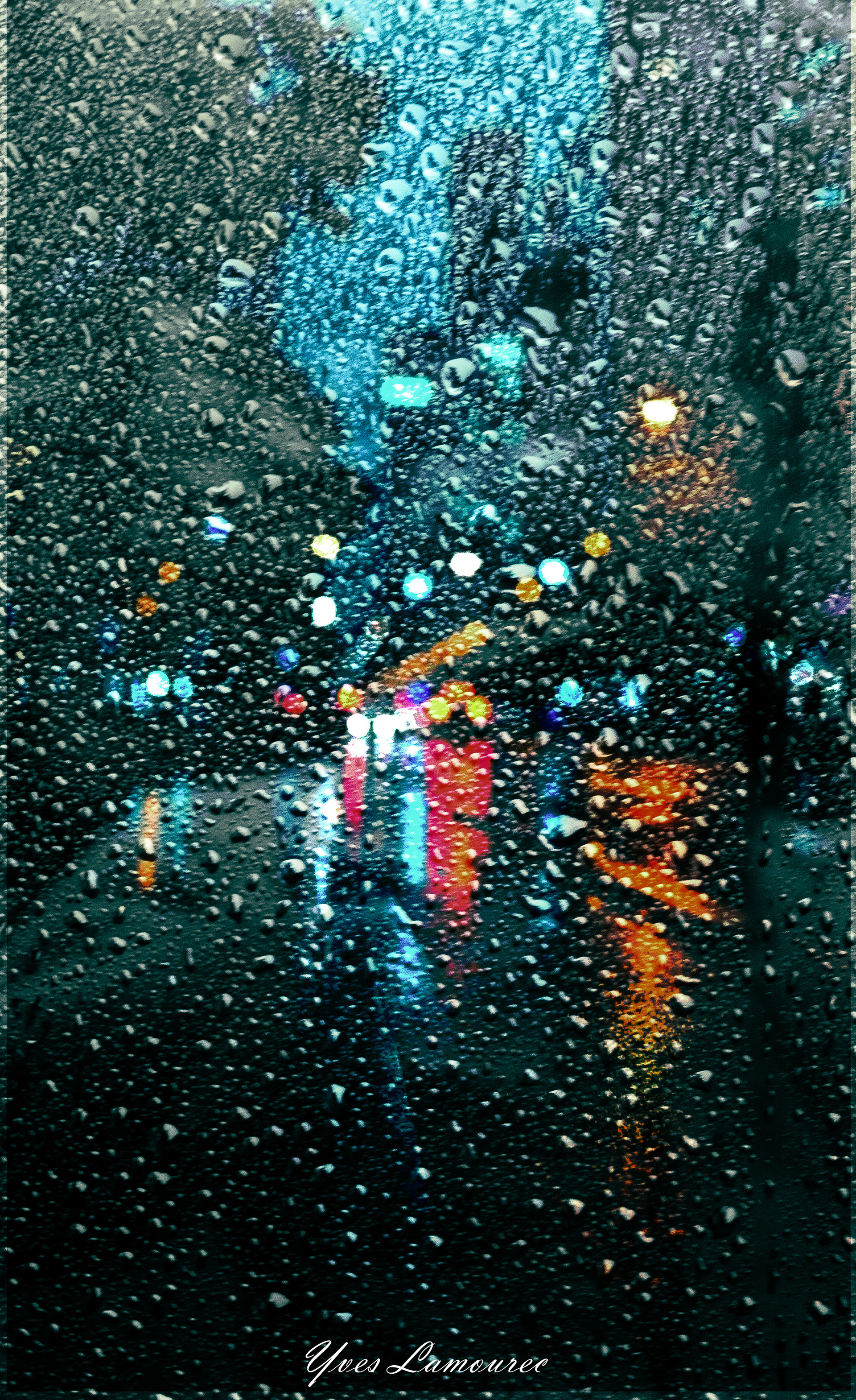 La pluie strie l’image comme un rideau, diluant les contours de la ville et transformant le sol en miroir vibrant. Les reflets dorés se fragmentent dans les flaques, mêlant le réel à une impression de rêve suspendu. Le mouvement n’est plus celui de la fête, mais celui du temps lui-même, ralenti, répétitif.