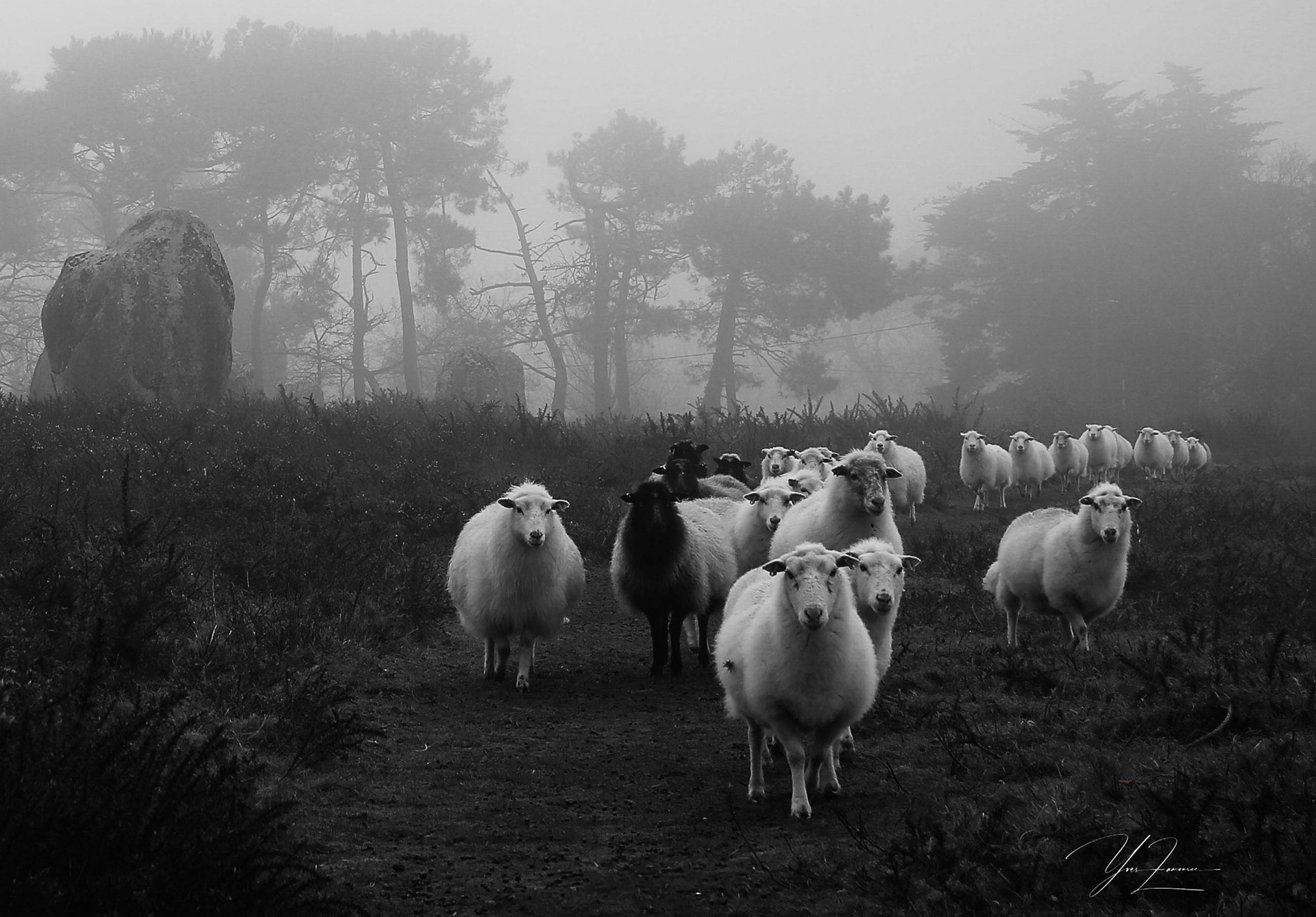 Cette œuvre dévoile un troupeau de brebis avançant silencieusement dans un paysage embrumé, où les silhouettes d’arbres et de pierres se dissolvent dans la lumière diffuse du matin. La scène, capturée en noir et blanc, évoque une atmosphère cinématographique où la nature respire avec lenteur.