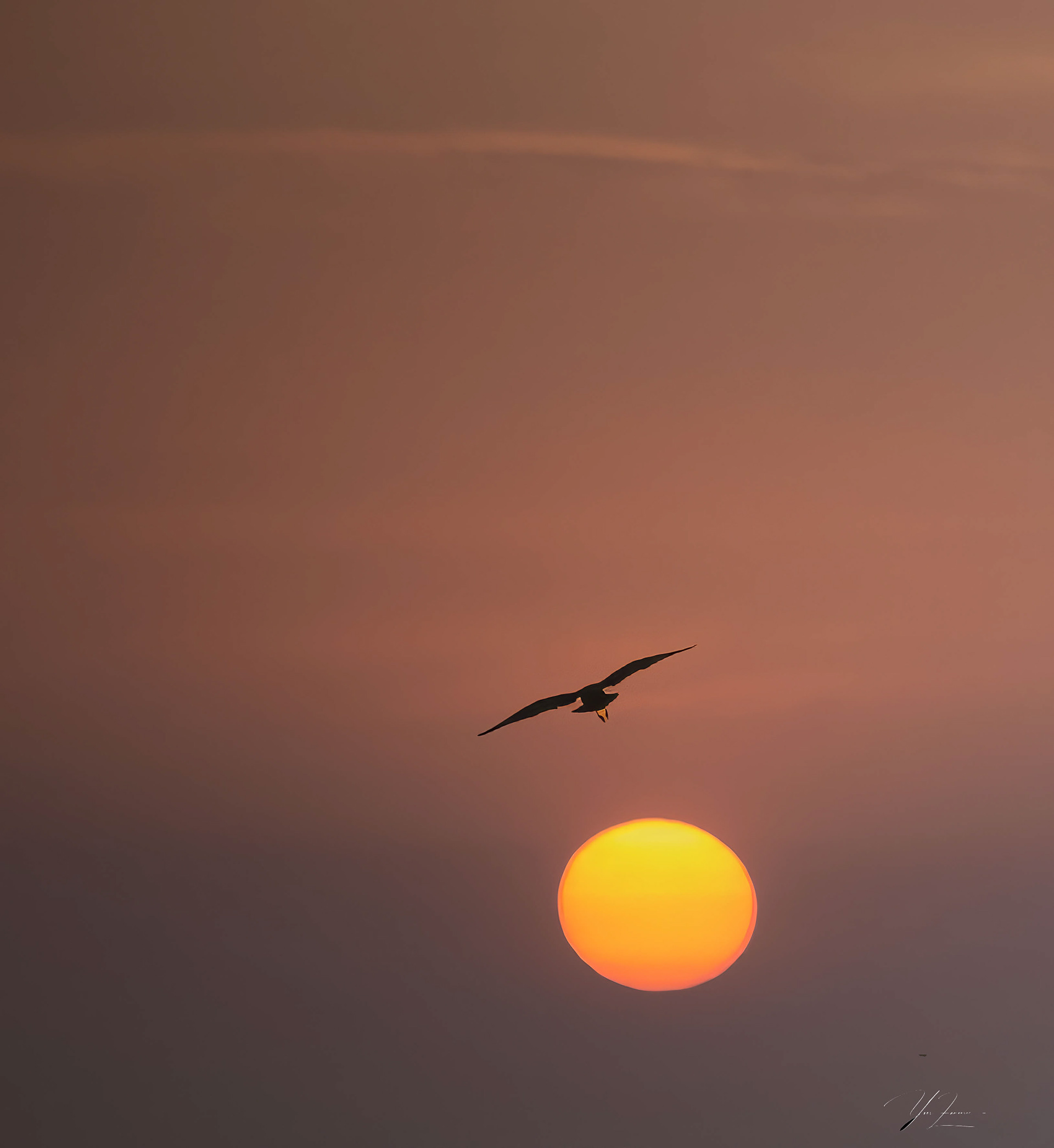 Le contraste des silhouettes et l’éclat incandescent de la mer créent une composition vibrante, où chaque battement d’aile répond au souffle de l’océan.