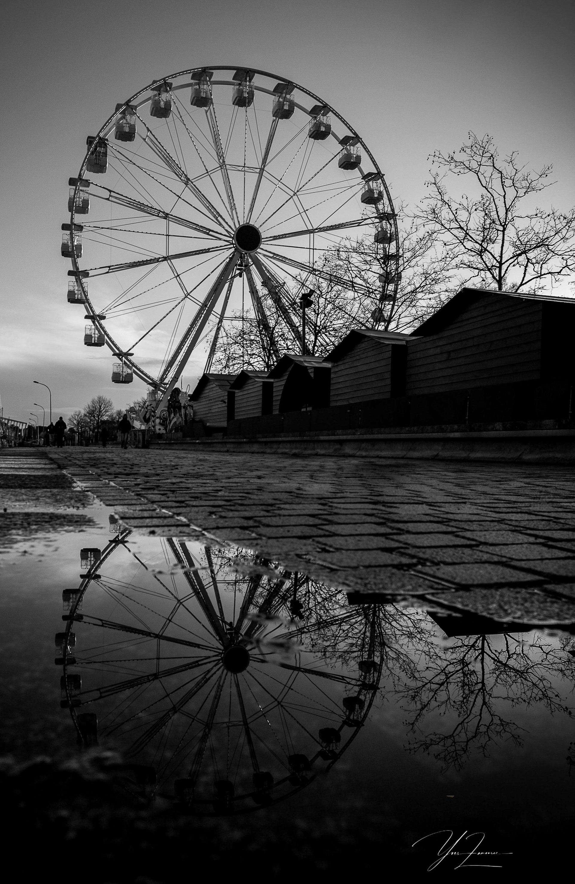 Cette œuvre en noir et blanc présente une grande roue urbaine dont le reflet dans une flaque d’eau crée une symétrie fragile et hypnotique.