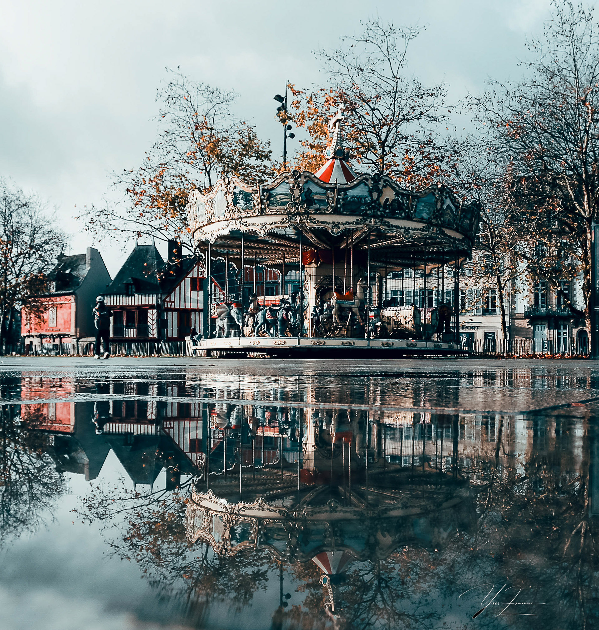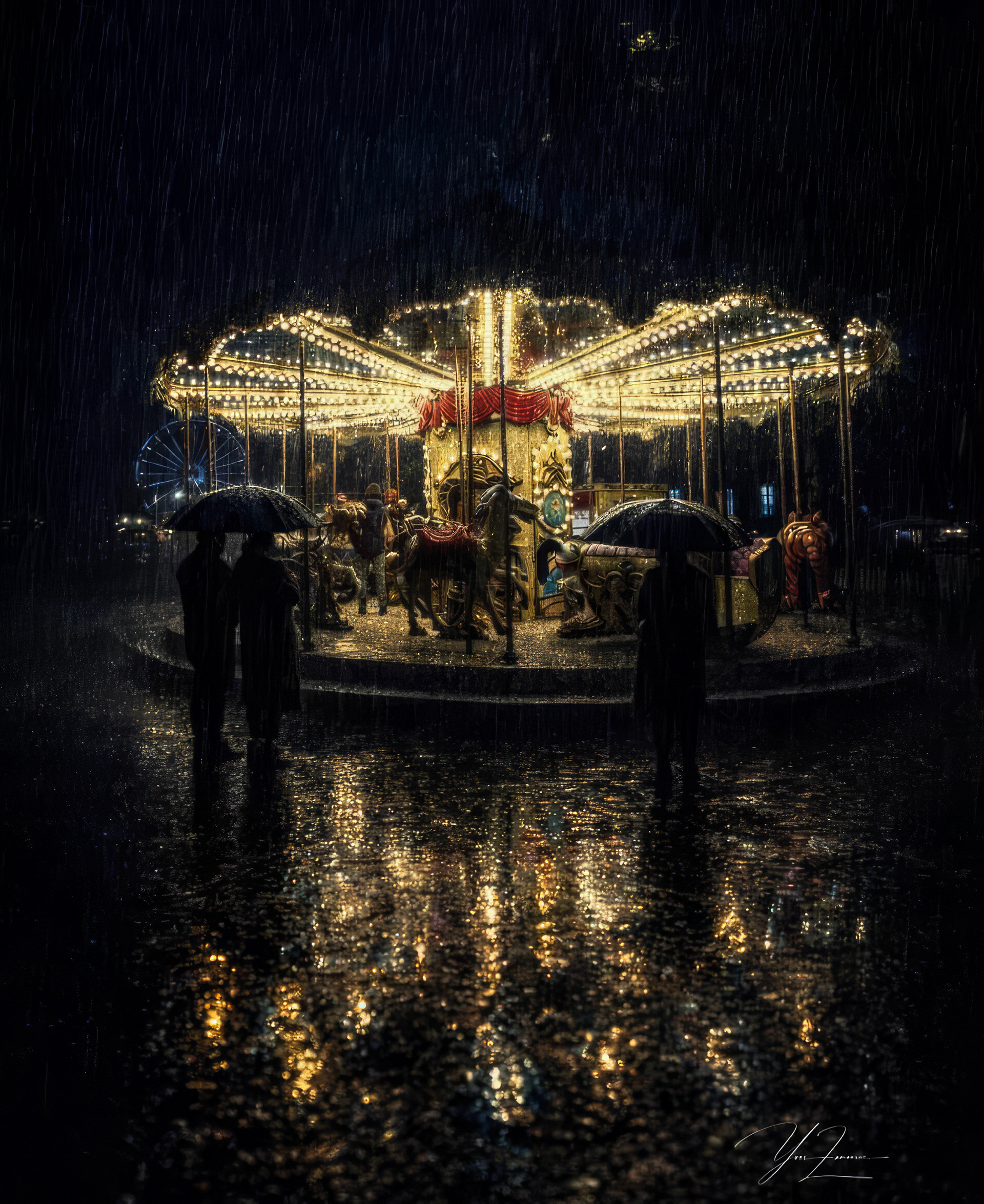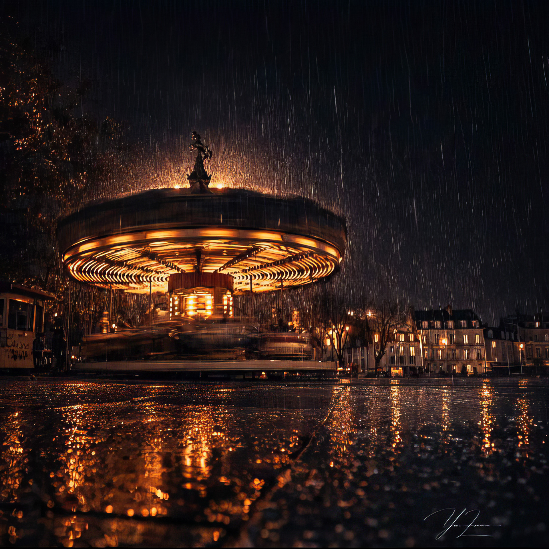 Sous la pluie battante, le manège tourne lentement, auréolé d’une lumière chaude qui tranche avec la nuit environnante. Les cercles lumineux dessinent un mouvement continu, presque hypnotique, tandis que la statue au sommet demeure immobile, gardienne silencieuse de cette ronde infinie.