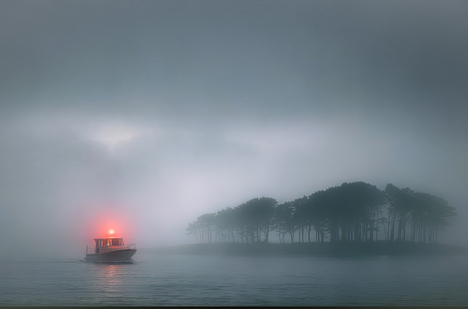 Une embarcation fend lentement la brume, laissant apparaître une lueur rouge comme unique repère dans le silence. L’île sombre se dessine en arrière-plan, frontière incertaine entre présence et disparition.