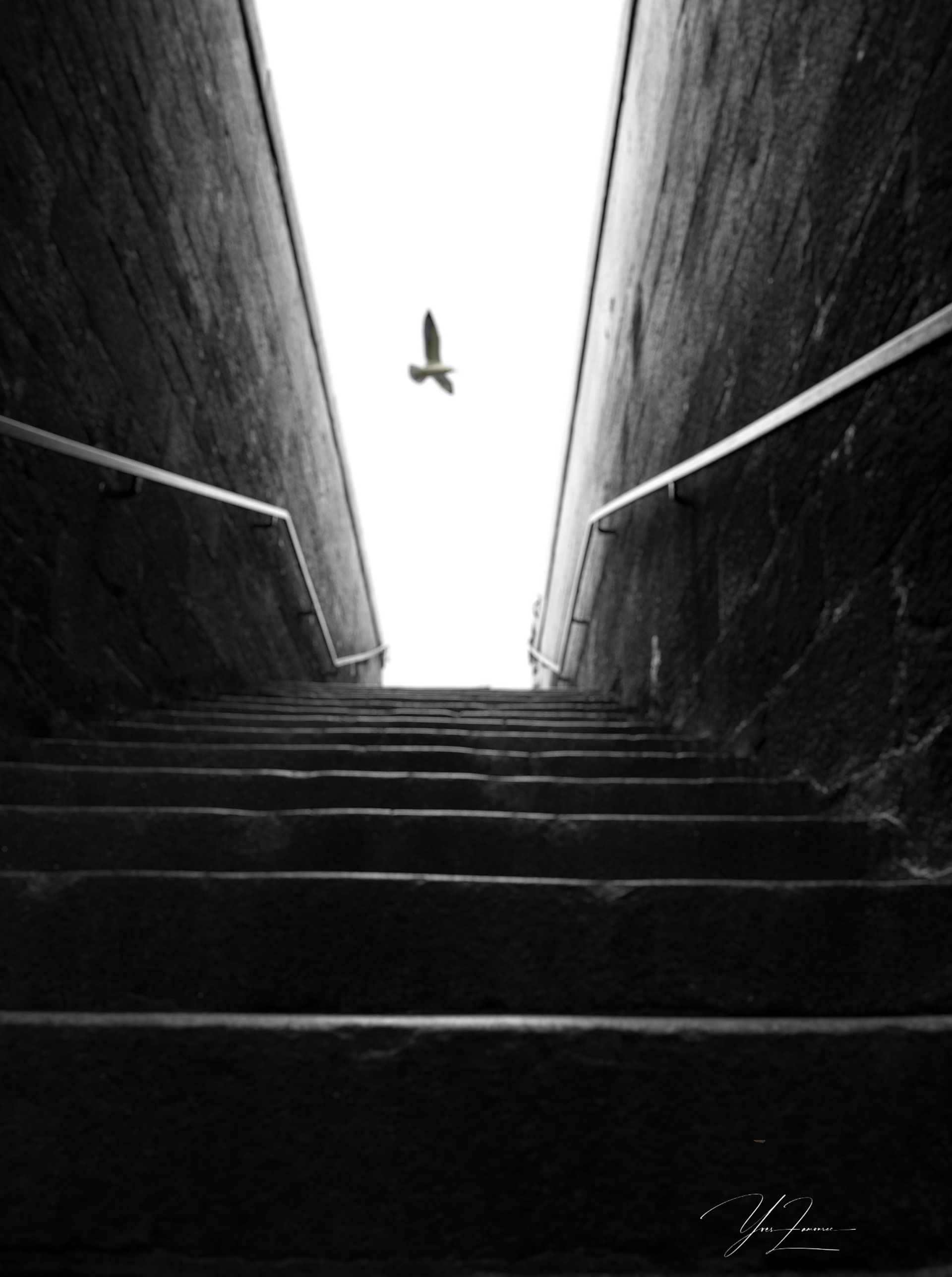 La silhouette d’un oiseau, suspendue dans cet espace lumineux, apporte une dimension poétique et symbolique, évoquant l’idée de liberté, de dépassement et d’élévation.