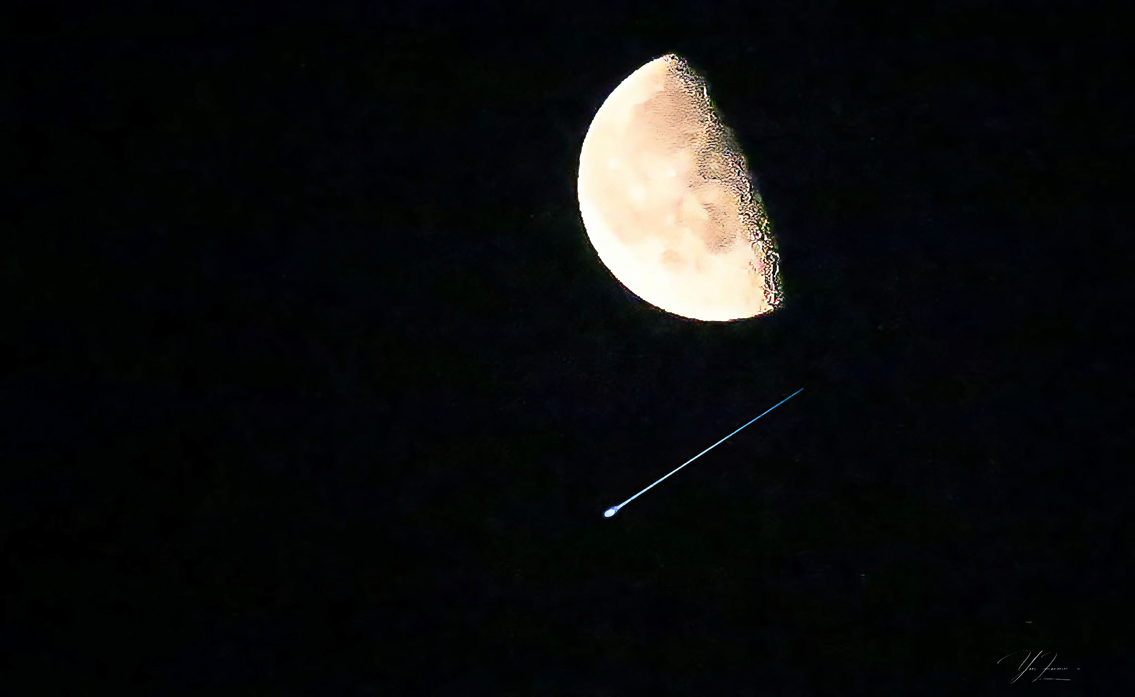Photographie nocturne minimaliste montrant la Lune et la trace lumineuse d’un météore ou d’un objet céleste.