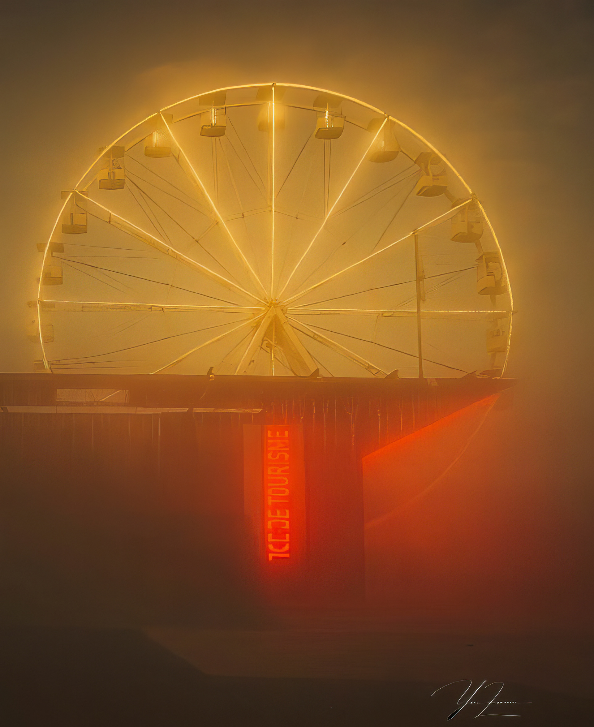 Émergeant de la brume comme une apparition silencieuse, la grande roue se dresse dans une lumière dorée presque irréelle. Les lignes géométriques de sa structure, soulignées par l’éclat artificiel, contrastent avec l’atmosphère diffuse qui efface les repères spatiaux et temporels.