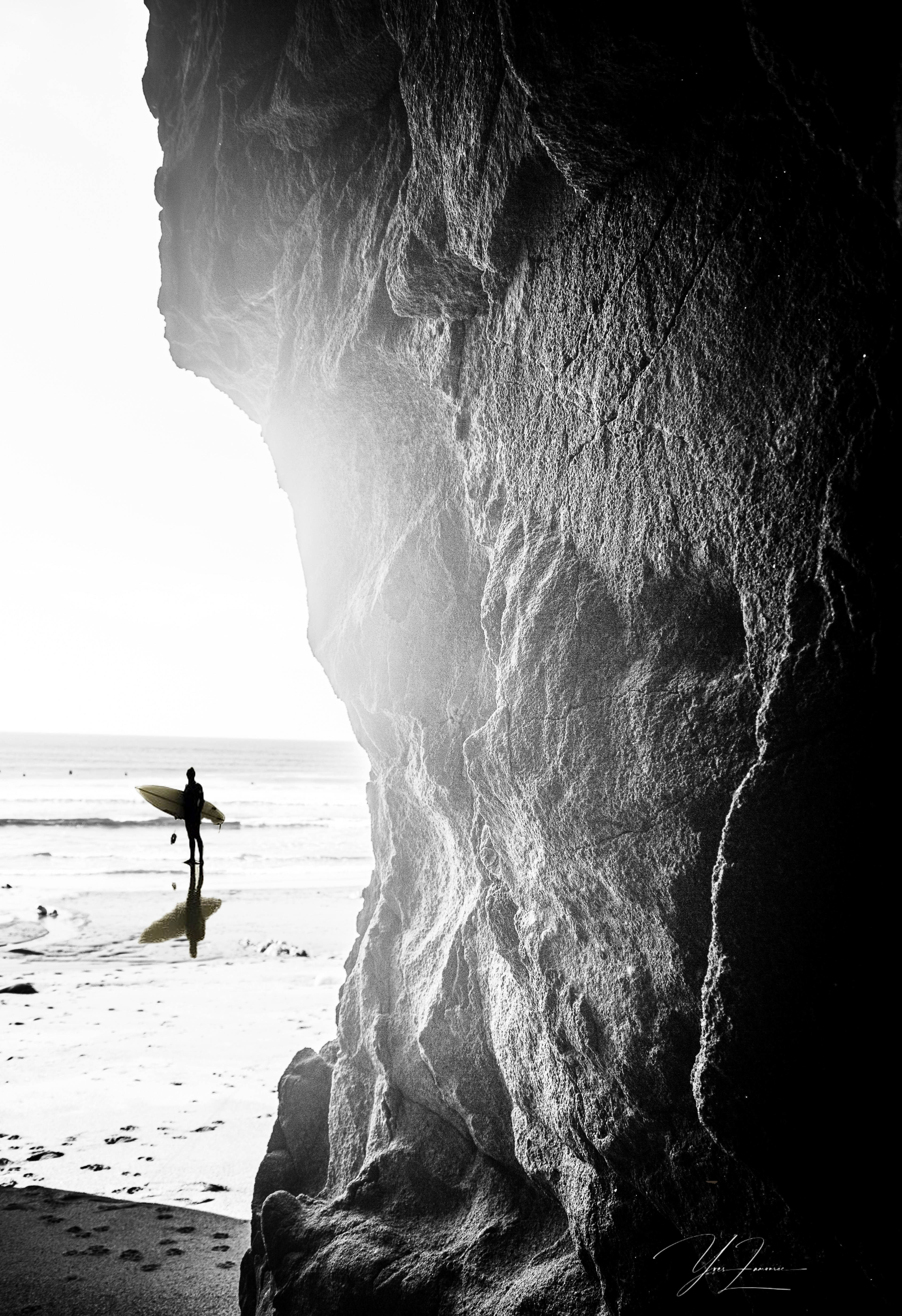 Cette œuvre capture l’instant suspendu où un surfeur apparaît au seuil d’une grotte, silhouette solitaire face à la lumière de l’océan. Le contraste entre la rugosité minérale et l’éclat du rivage crée une scène presque théâtrale, où l’ombre et la clarté dialoguent.