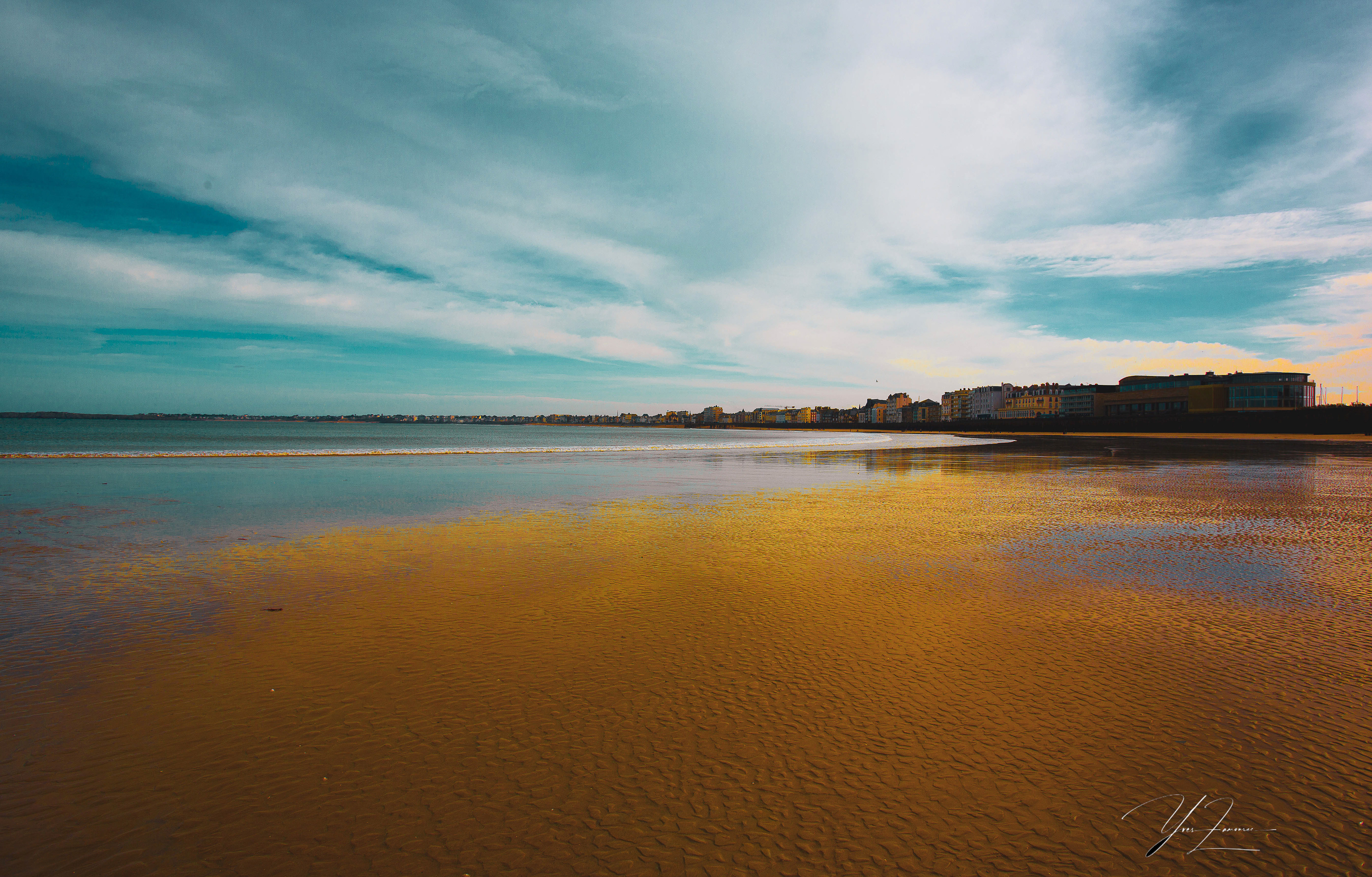 Cette œuvre dévoile l’ampleur de la plage de Saint-Malo à marée basse, où le sable fin reflète un ciel aux nuances changeantes. La ligne urbaine, étirée le long du rivage, contraste avec l’immensité de la mer et la douceur des nuages, offrant une vision à la fois calme et vivante du littoral malouin.