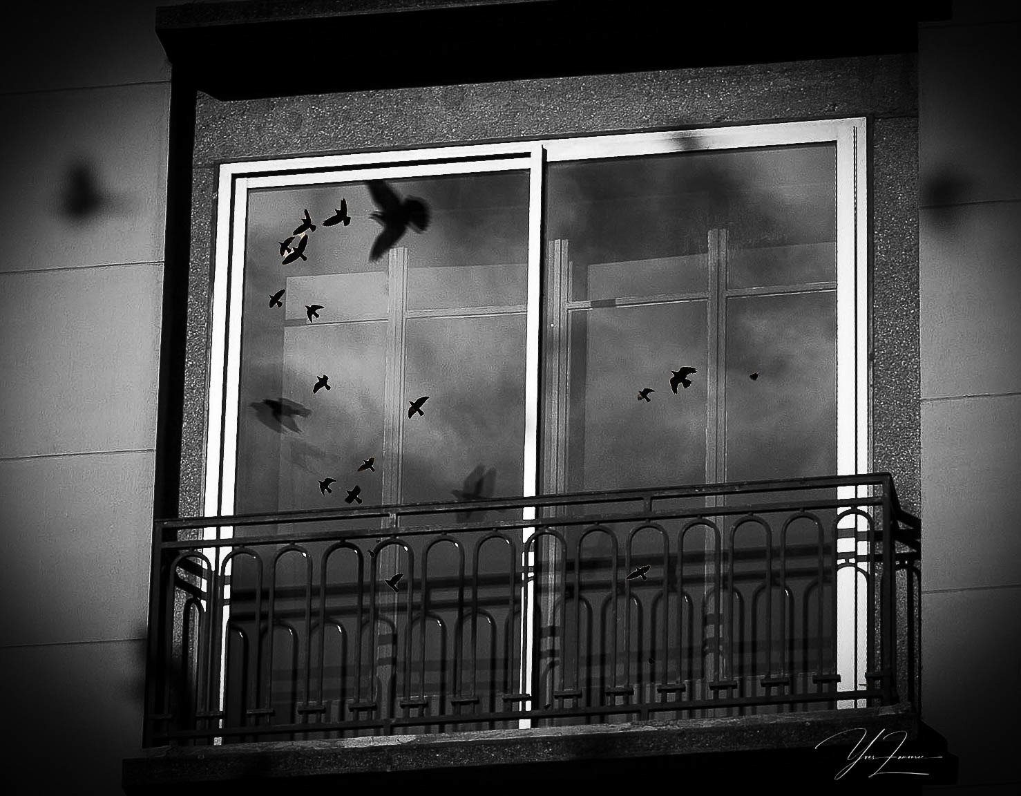 Une façade sobre, un balcon de fer, et sur le verre une nuée d’oiseaux qui n’existe qu’en reflet.