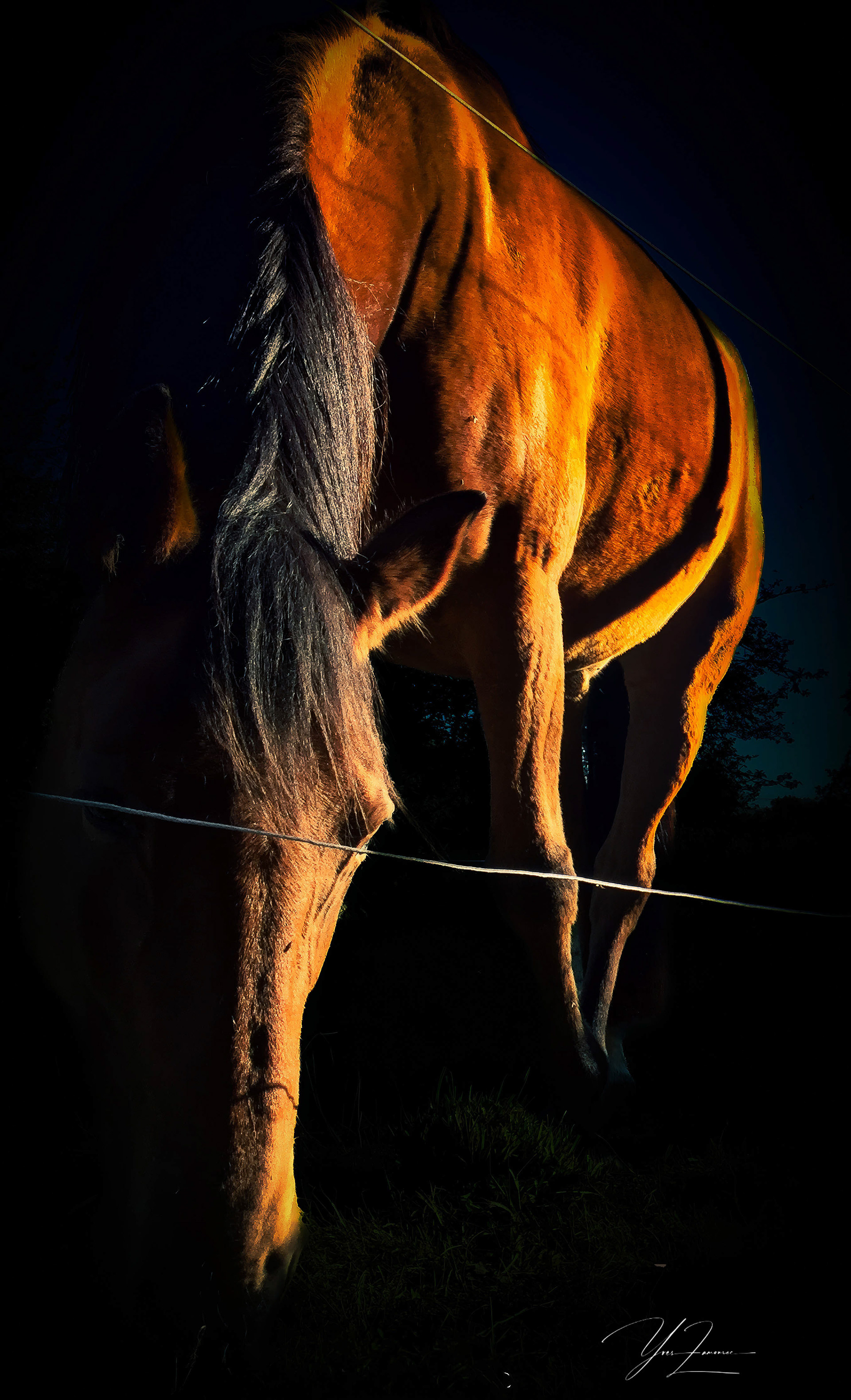 Cette œuvre présente un cheval dans un clair-obscur dramatique, dévoilé par une lumière dorée qui sculpte sa silhouette.
